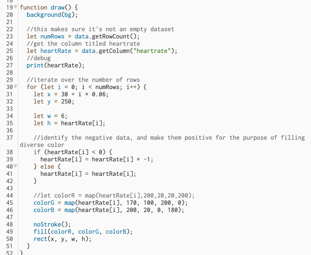 - Secondly, to represent each number in the dataset, I assign its value to the height (h) of a rectangle. To avoid overlapping, I use a for-loop to horizontally map the rectangles across the entire canvas.