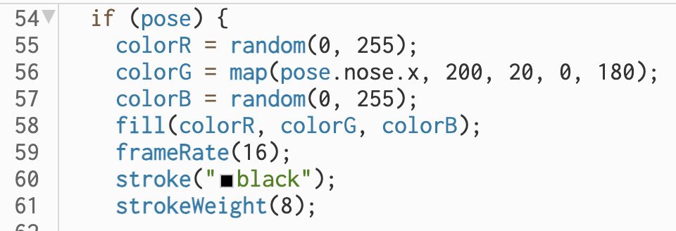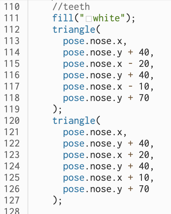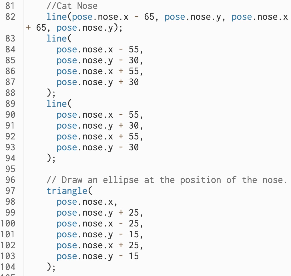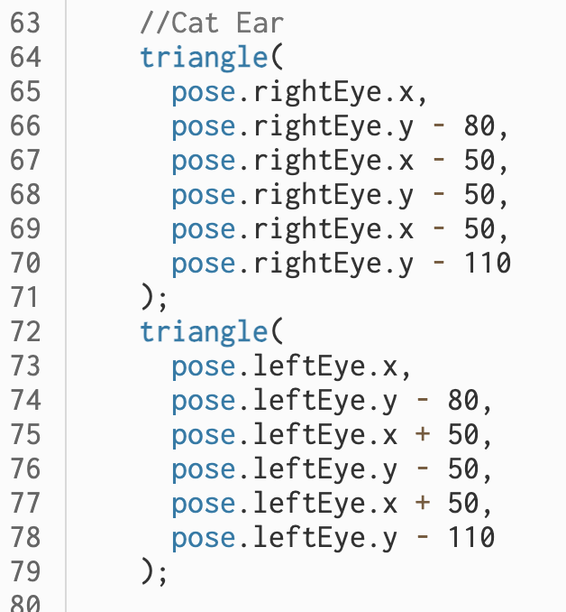To add versatility, fun, and interactivity. I introduced the map() function in the code to determine the color of the fill by the position of the user’s nose, using the green parameter of the RGB value. The final effect is that the user will be transformed into a blinking cat, and the colors are mainly red and blue and will keep changing according to the user’s location.