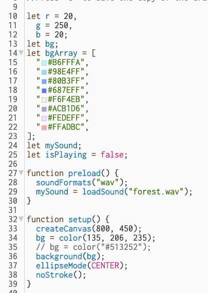 In this part, I concrete several important global values, including the RGB color of the trees, and the background color array. Besides, I also preload() the background sound to improve program efficiency.
