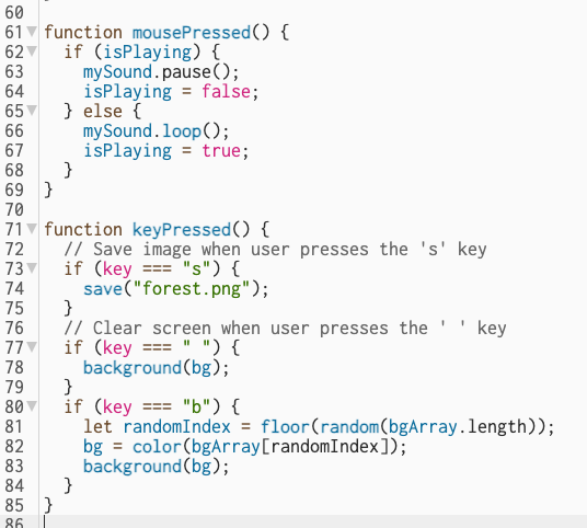 By introducing mousePressed(), I intend to add a control of the start and pause of the drawing function to prevent users from being overwhelmed by the sound and piles of trees. In this case, the user can click to start and click to pause easily.