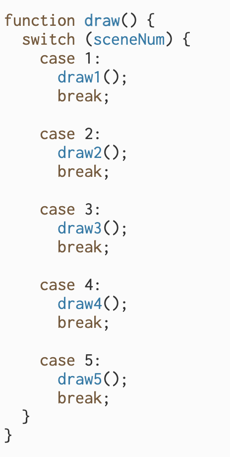 - To prevent chaos in background music, when introducing multiple drawing functions (as I separate the main draw( ) function into 5 parts), the bgMusic.play( ) should be put in the setup( ) function instead of the main draw( ) function.
